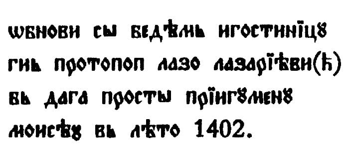 - Ne bi mogao biti pravoslavni (grÄko-iztoÄni) ā vlaÅ”ki (bugarski) niti Ā srbski natpis iz 1402., jer na ploÄi bi morala biti zapisana 6910. godina āod stvaranja svietaā, napisano ÄiriliÄnim slovima, ne arapskim brojkama.