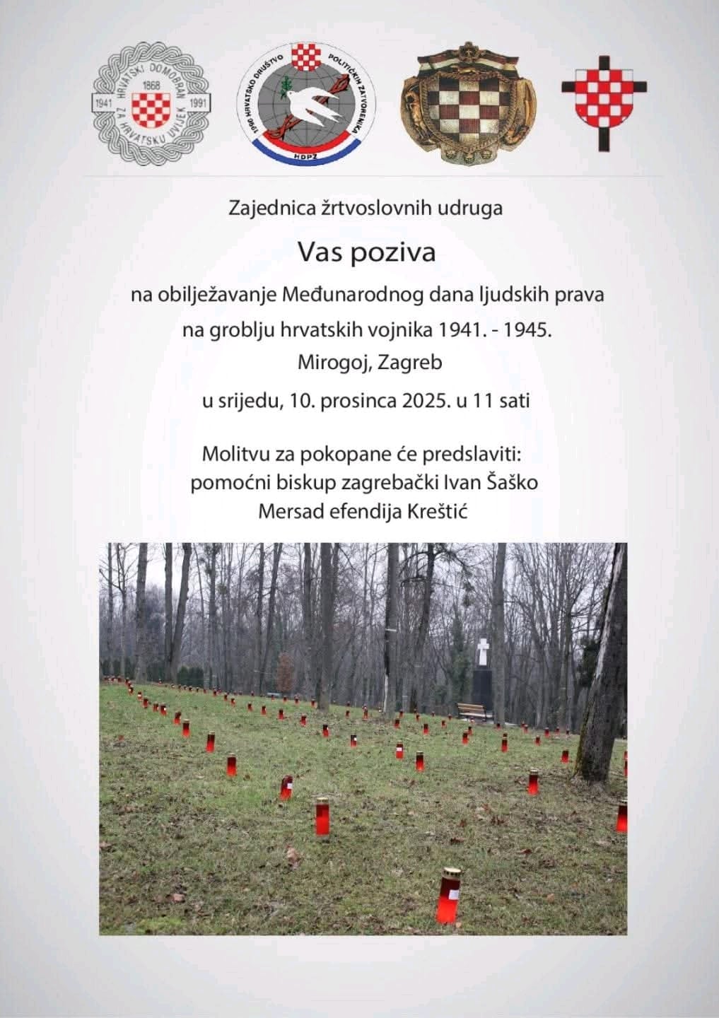 Zajednica žrtvoslovnih udruga poziva građane na obilježavanje Međunarodnog dana ljudskih prava na groblju hrvatskih vojnika iz razdoblja 1941.–1945. na Mirogoju, gdje će se održati komemoracija u srijedu u 11 sati. Molitvu za pokopane predvodit će pomoćni biskup zagrebački Ivan Šaško i Mersad efendija Kreštić.