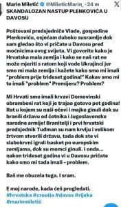 Hrvatsku u Davosu dostojno predstavlja Andrej PlenkoviÄ i hvala Bogu, nismo mi tema na dnevnom redu, niti je tema naÅ” problem ili velikosrpska agresija, veÄ su tema Grenland i Ukrajina koju naÅ” predsjednik MilanoviÄ ne smatra Äak ni problemom. O tome Marin MiletiÄ (vjerouÄitelj) Å”uti kao zaliven. Bitno je da MilanoviÄa citira Lavrov, no to nije bitno Marinu MiletiÄu. Ne osjeÄa susramlje? Dakle nije mu bitno ono Å”to se dogaÄa danas, svake minute, ali mu je bitno Å”to je PlenkoviÄ naÅ” rat nazvao problemom i to je svetogrÄe. To kod MiletiÄa izaziva sram, kao da on nema svojih problema kojih bi se trebao sramiti? VjerouÄitelj! A bit teme koja se neÄe spomenuti jest model koji se predlaže u krugovima meÄunarodne zajednice, da se rjeÅ”enje hrvatskog āproblemaā može primijeniti i na Ukrajinski āproblemā!